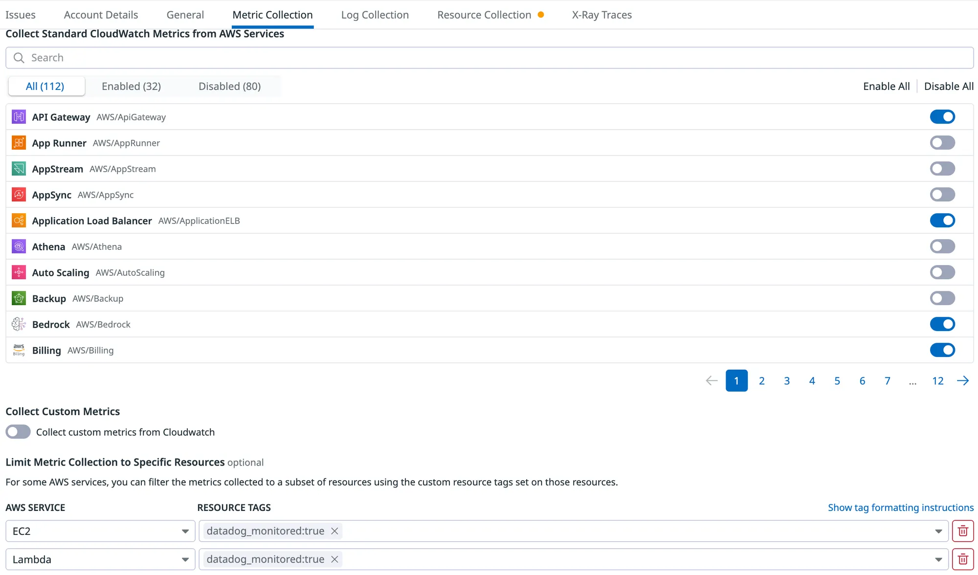 datadog_monitored:truein our case. - Confirm that service-specific data collection is not restricted on AWS Lambda.