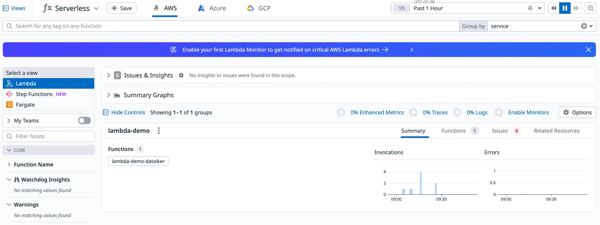 Datadog Serverless View with Issues and Insights